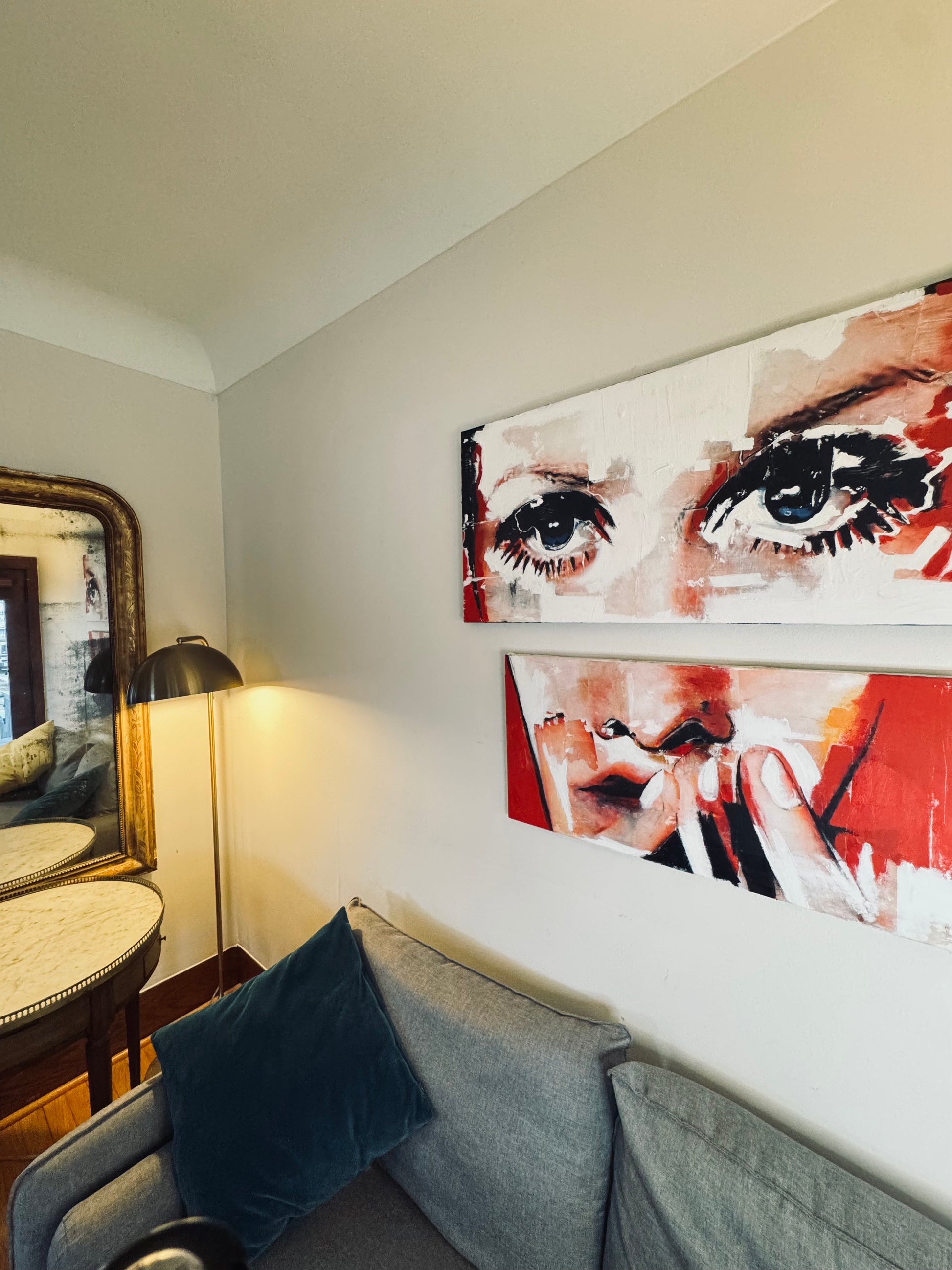 Les Yeux is a diptych from the eyes series, featuring two canvases of varying horizontal sizes. The top frame focuses solely on the eyes, capturing their intensity and depth, while the bottom frame is dedicated to the mouth and nose. These elements are separated by empty space, emphasizing the distance between them and creating a stark contrast between facial features. The piece reflects the power of gaze and expression, inviting the viewer to reflect on the significance of these parts of the face and their connection to identity.
