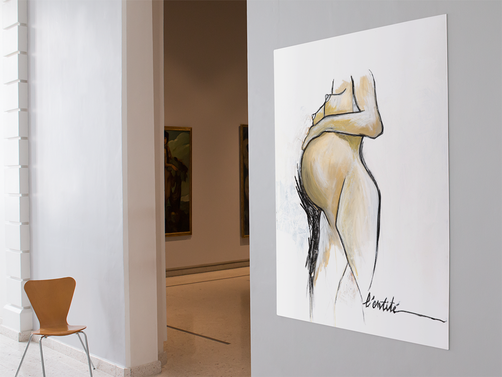 L’Entité is a monochromatic painting featuring a pregnant woman without a head, created with white, gold, and bold black strokes. This piece highlights the profound role of the body as a vessel for new life, while exploring the emotional experience of feeling reduced to that role. It delves into the attention given to the pregnancy, often overshadowing the individuality of the person carrying the child, and questions what happens once the baby is born. Through its striking contrasts and minimalist tones, L’Entité invites reflection on identity, motherhood, and the transition between the two.